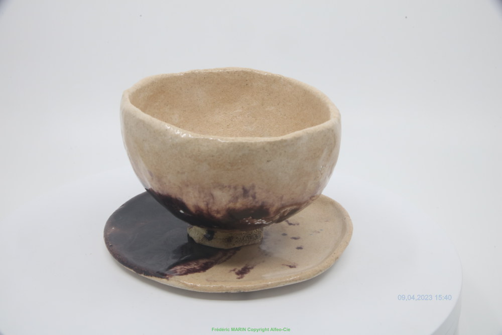 Bol accompagné de sa soucoupe, en terre finement chamottée, avec un émail mélangé avec de l’oxyde de manganèse, et dopé au jus d’oxyde de manganèse