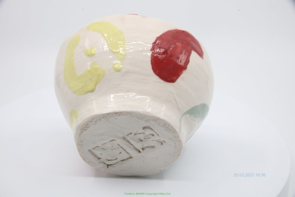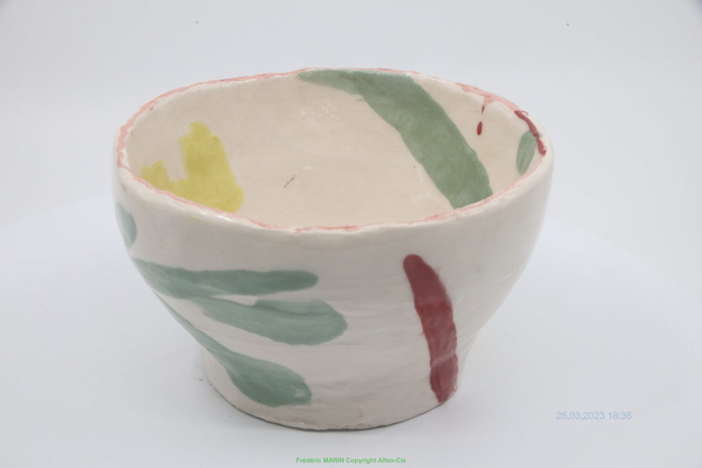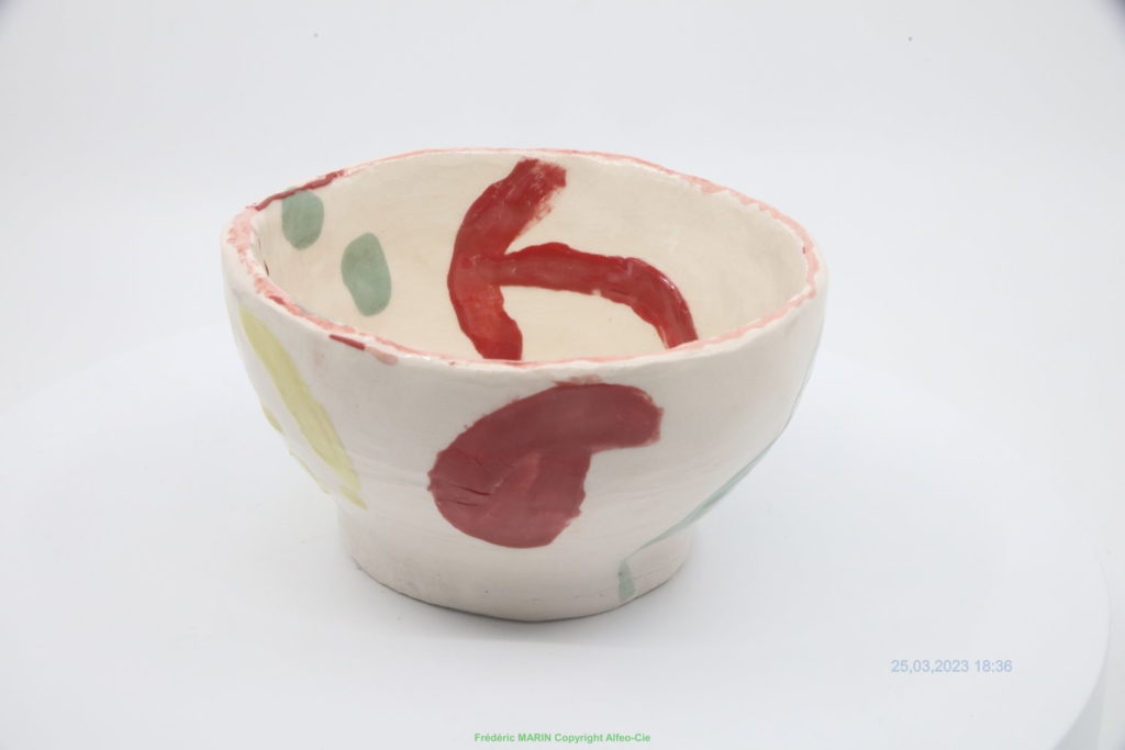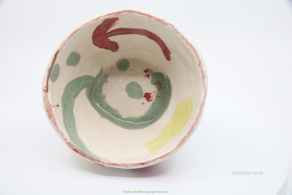 bol monté en colombin, décoration engobe, émaillé en émail transparent brillant non plombeux