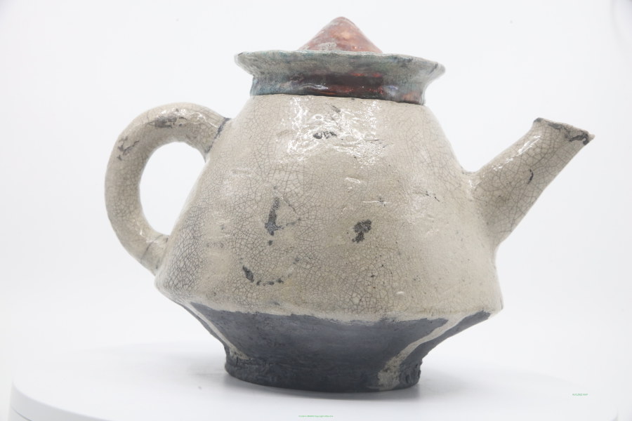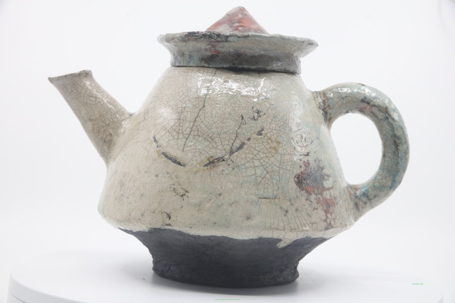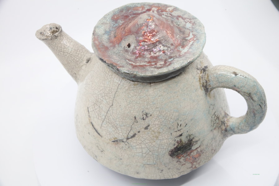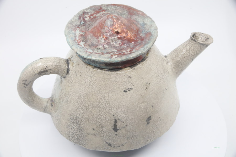 Théière en modelage, cuisson raku, dopée au jus de sulfure de cuivre et de fer et au nitrate d’argent, décorée avec une frite teintée de nitrate d’argent
