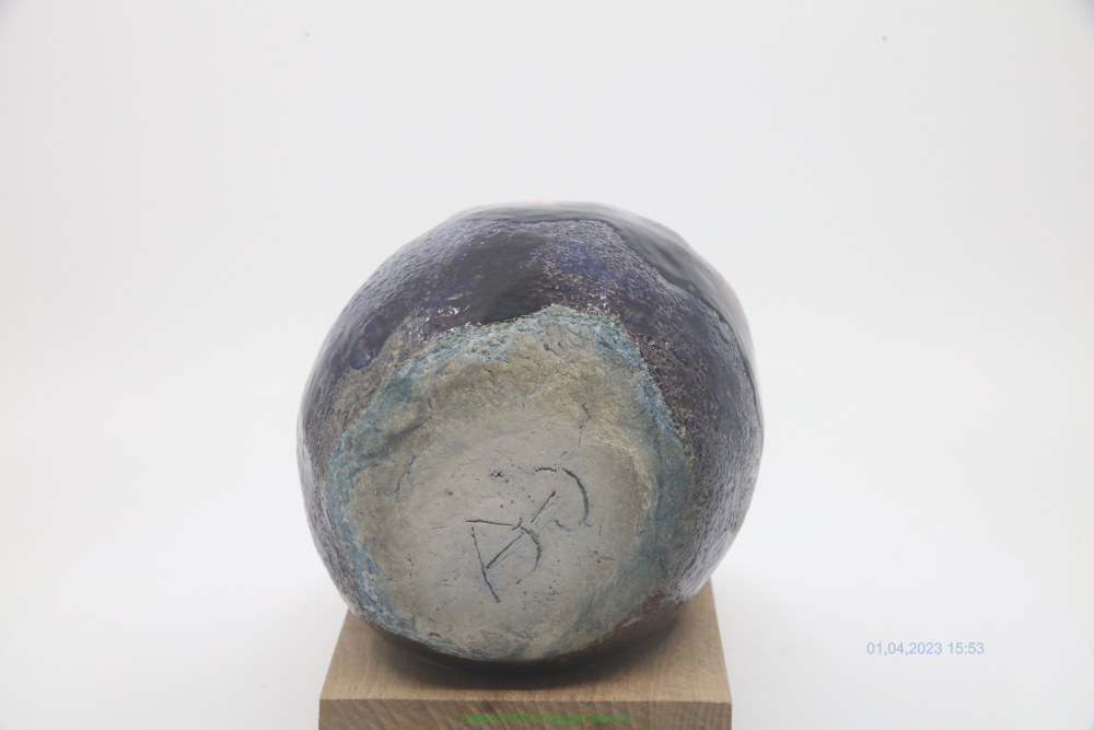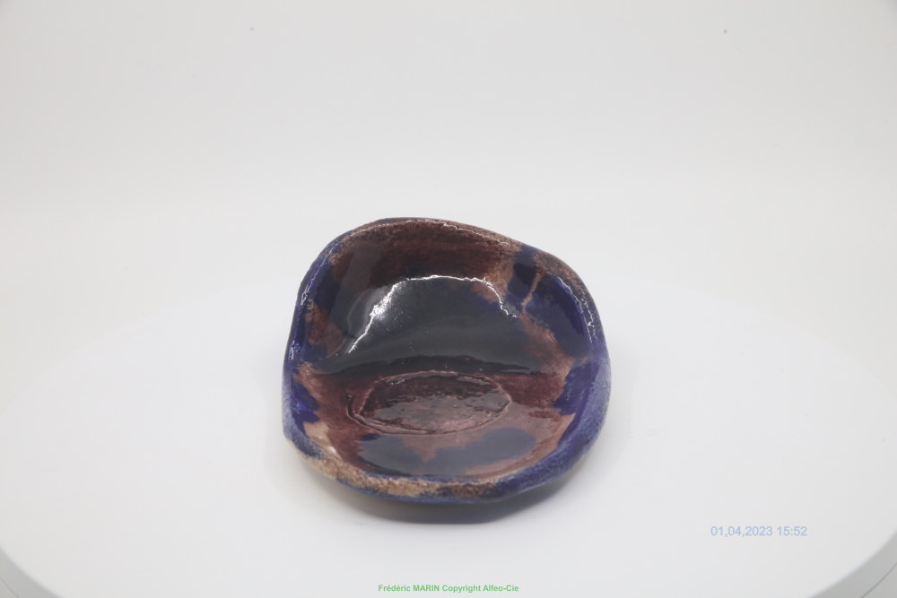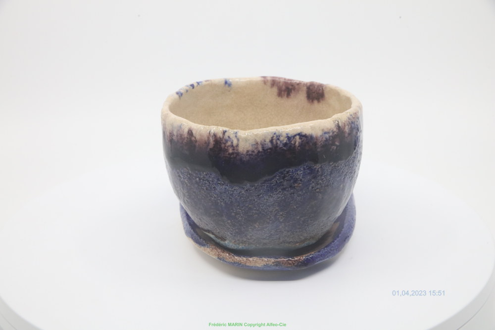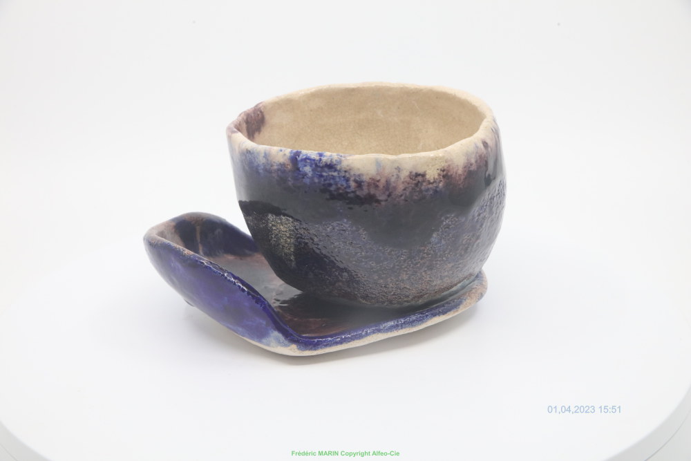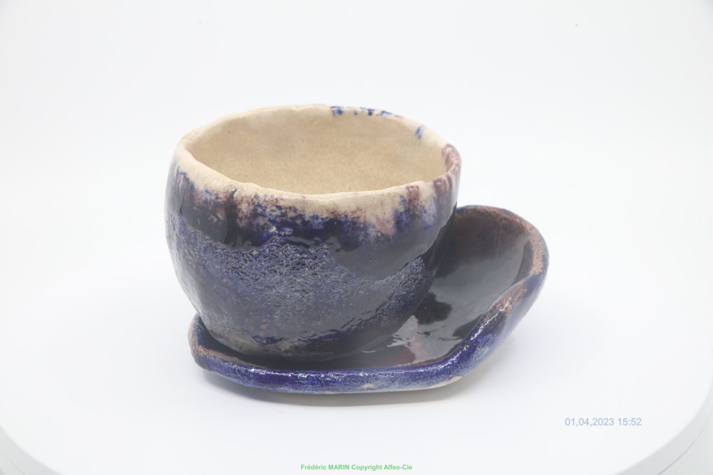 Petit bol accompagné de sa soucoupe, en terre finement chamottée, avec un émail aux oxydes de cobalt – zinc – dopé au jus de bi-oxyde de manganèse
